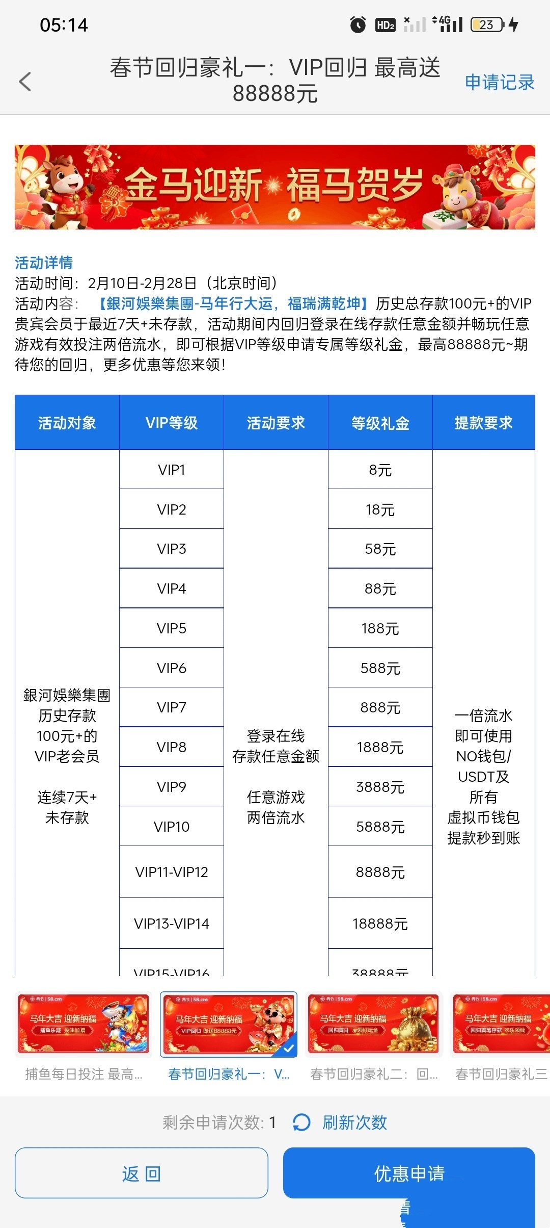 官网58.cm 15号之前充值10块钱可以领等级礼金,然后有会员等级的9天没充值过有流水娱乐过提现的也可以充值十块钱打两赔流水可以申请vip回归彩金