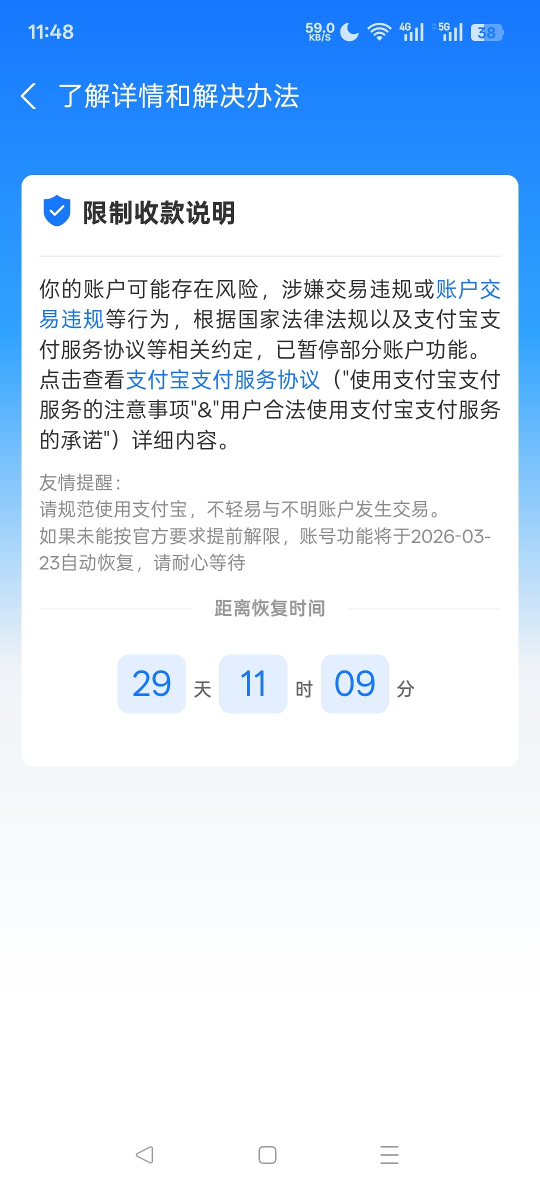 我两个支付宝,一个限制用另外一个,两个都限制就注销一个重新注册,次数多了重新注册也不行,注册就限制15天…