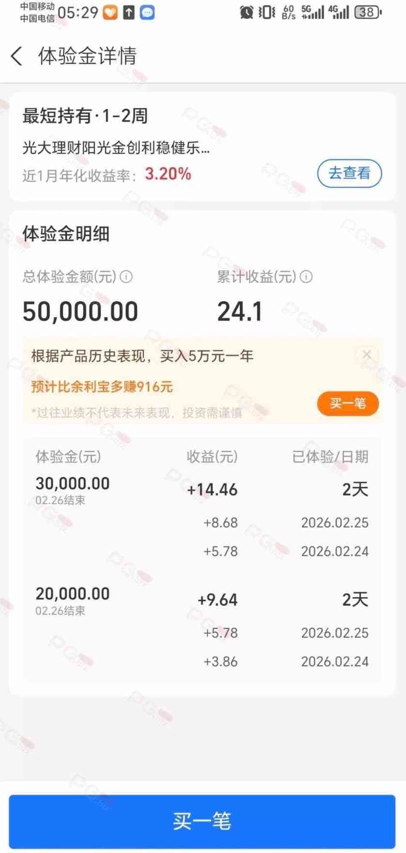 在支付宝会员里面用积分兑换这50000体验金,很便宜二百来个积分,好像是体验两天还是三天,反正我这体验两天都二十多块了,不过有点慢,得10来天,反正是白嫖兑换了到时间转到支付宝余额就好,也不费时间