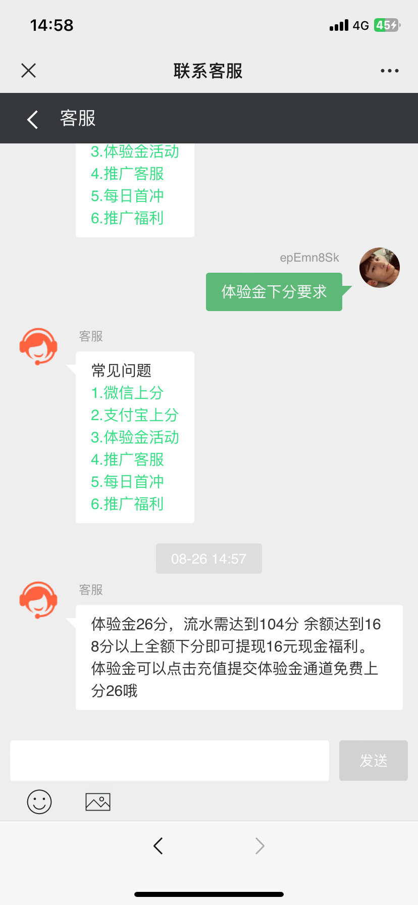 体验金26分,流水需达到104分 余额达到168分以上全额下分即可提现16元现金福利。 体验金可以点击充值提交体验金通道免费上分26
