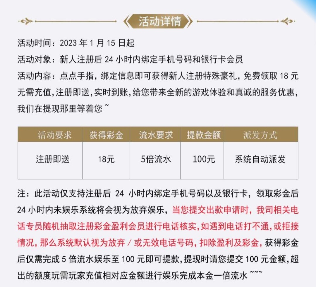 新用户注册秒18注意看下方图片规则 ,无游戏限制,五倍流水,只能提100,多的要充值,我的建议白嫖100就行,手机号多的无限撸。希望老哥们多多分享本站,叫上朋友一起撸干翻狗庄