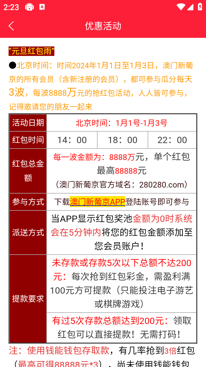 纯白嫖项目【禁止充值】注册绑卡下载APP,活动优惠里面自行申请彩金,2023年12月30日开始元旦3倍红包,每天3-4次,1号当天凌晨可以抢888到990元红包,完全不需要充值,每天还有免费红包抢,新人注册都有下载APP注册彩金送!!冲啊!!!