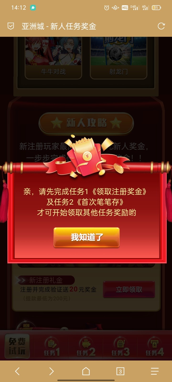 注册绑卡绑手机号 注册绑定好退出登录 输入密码登录的下面有个新手试玩 点新手试玩进去领 然后在我的优惠领取 不限制游戏 10倍 最低200提现