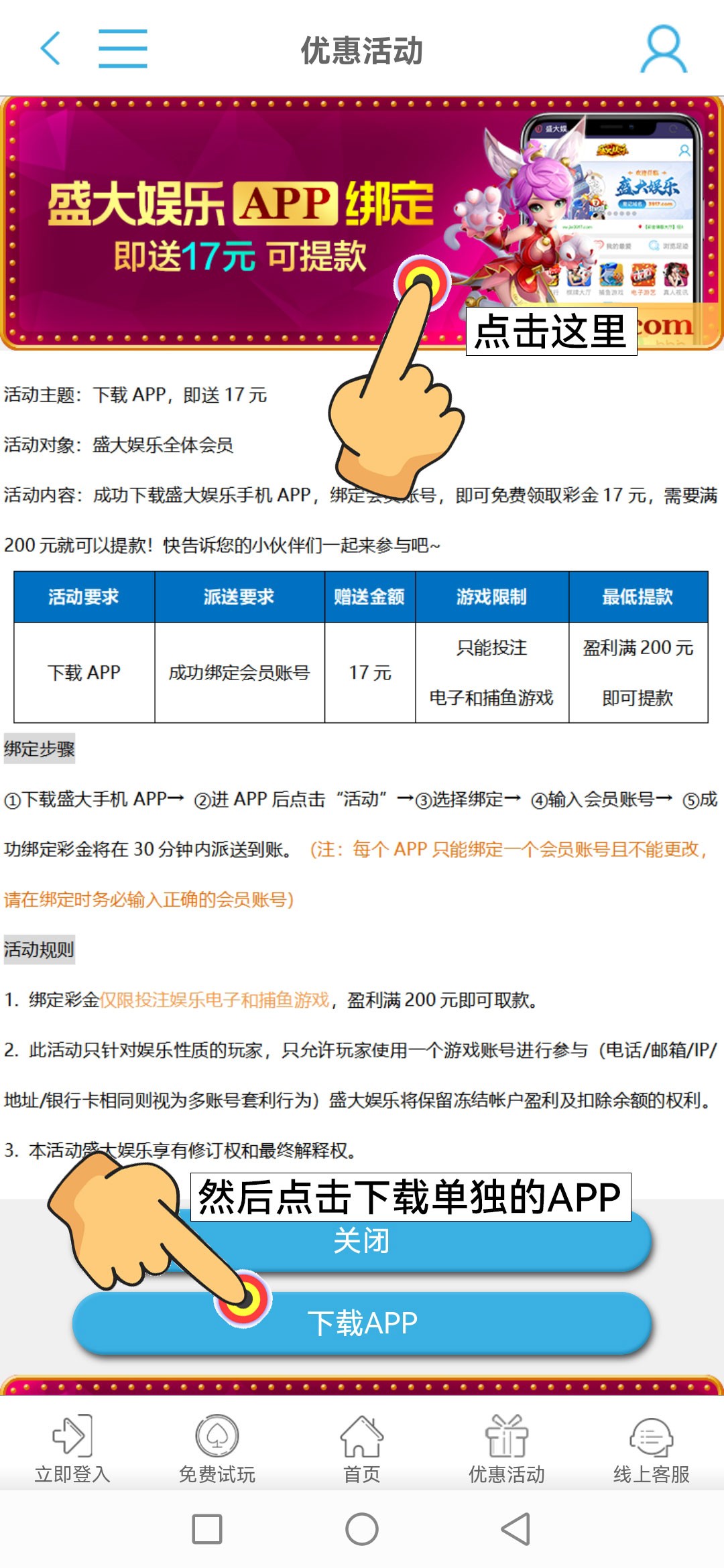 不定时免费盲盒不需要充值,绑定手机号必送17(可直接提现)多IP就换个无线网,每日签到积分兑换彩金,每日签到集卡也可兑换彩金,都不需要充值(绑定手机号的app跟游戏的app不是同一个要在活动里面链接下载),如果APP安装不了可以把应用商店暂时换成海外的,安装好再换回来
