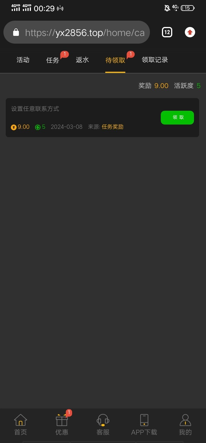 注册绑定银行卡,完善资料,然后到任务哪里就可以领取,出款上限188,人人都有,出款自测,充值后果自负