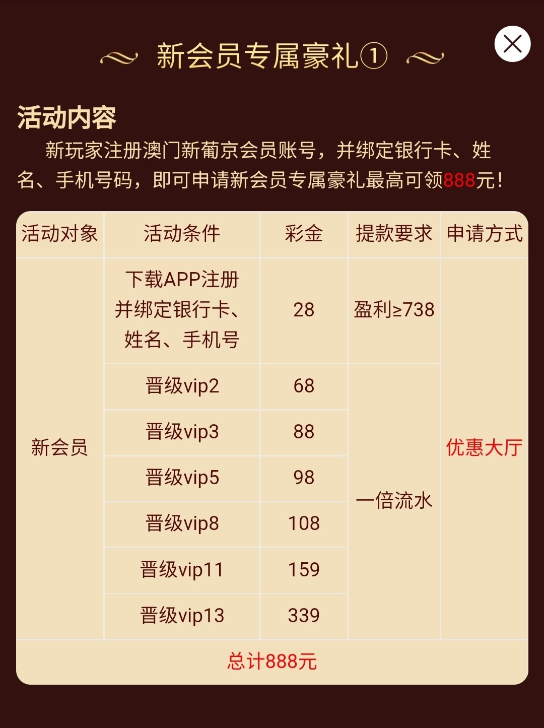 新用户注册完善资料,活动大厅申请28彩金。