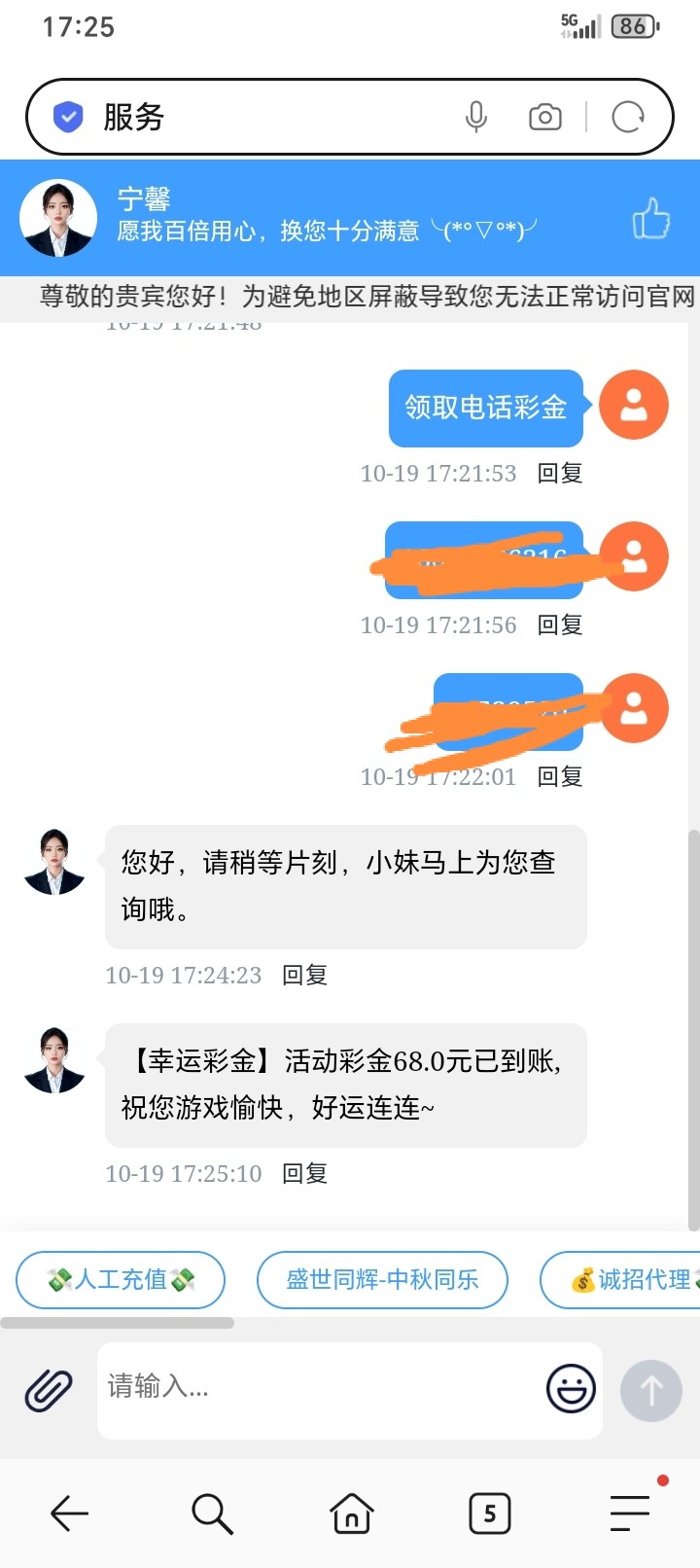 这个台子我以前充了好几万吧,很久没玩了也没接到过电话今天无聊去给客服发了电话彩金没想到送了。充值过的可以去碰一下。