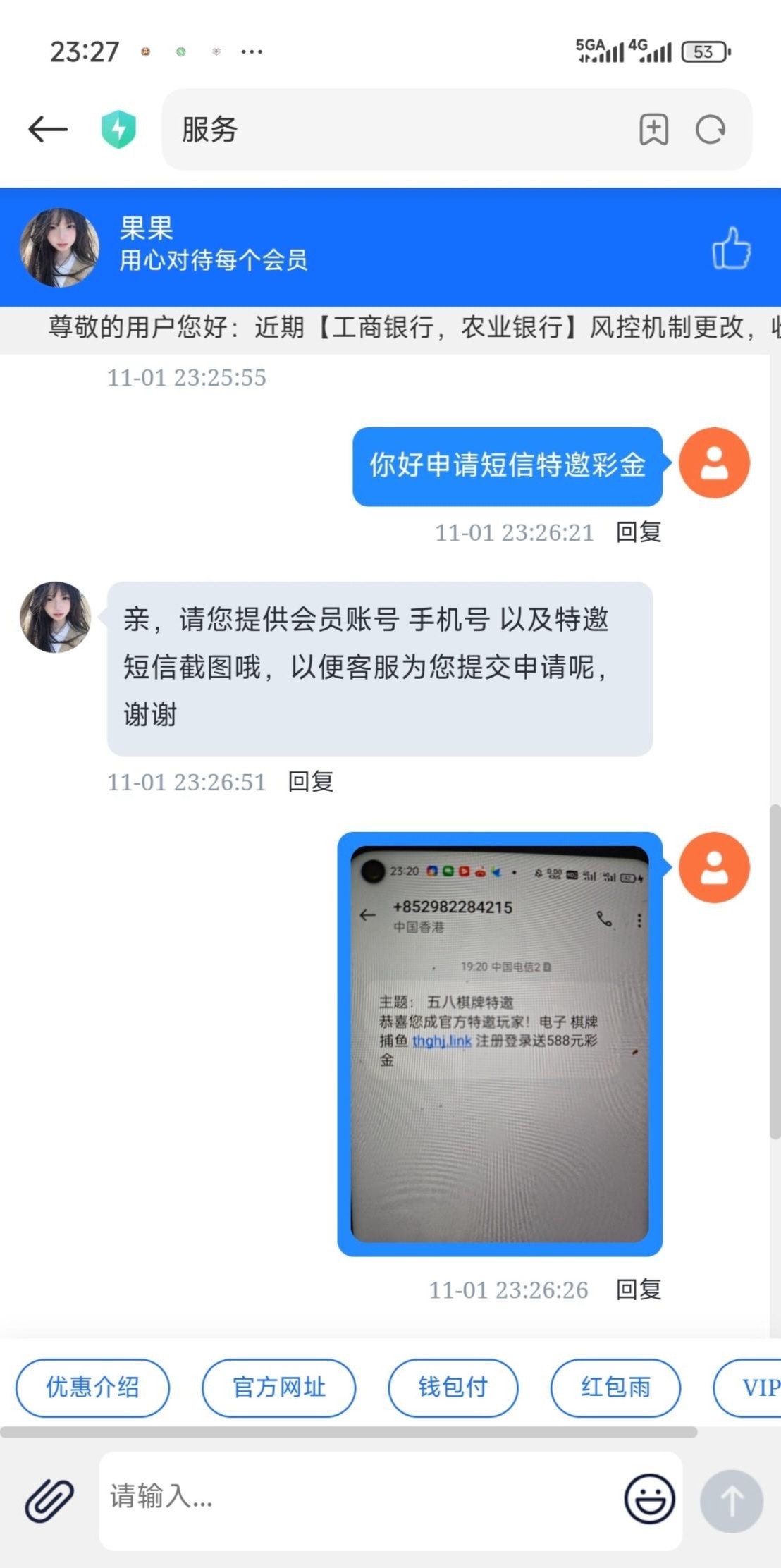 注册找客服领取短信特邀彩金,给了58,短信图在下面,收到这个短信的自己去,没收到就别碰了。只能打棋牌,祝老哥们都能打出来网址 thghj.link