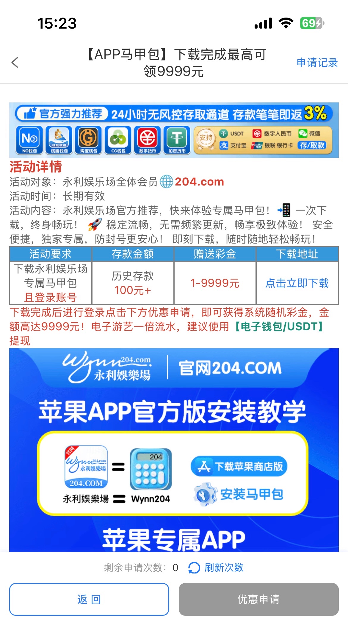 204.com 历史充值过100的申请马甲包 我申请了9