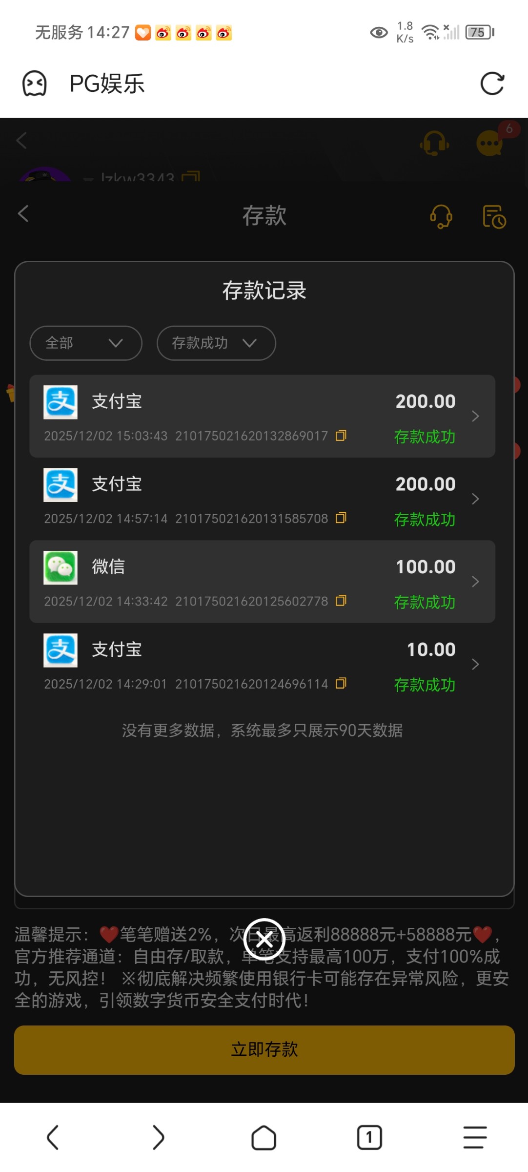 昨天玩了个短信台,用200过了几关真人到几千,然后磨电子,没水就磨真人,上了1w5,吃上肉了