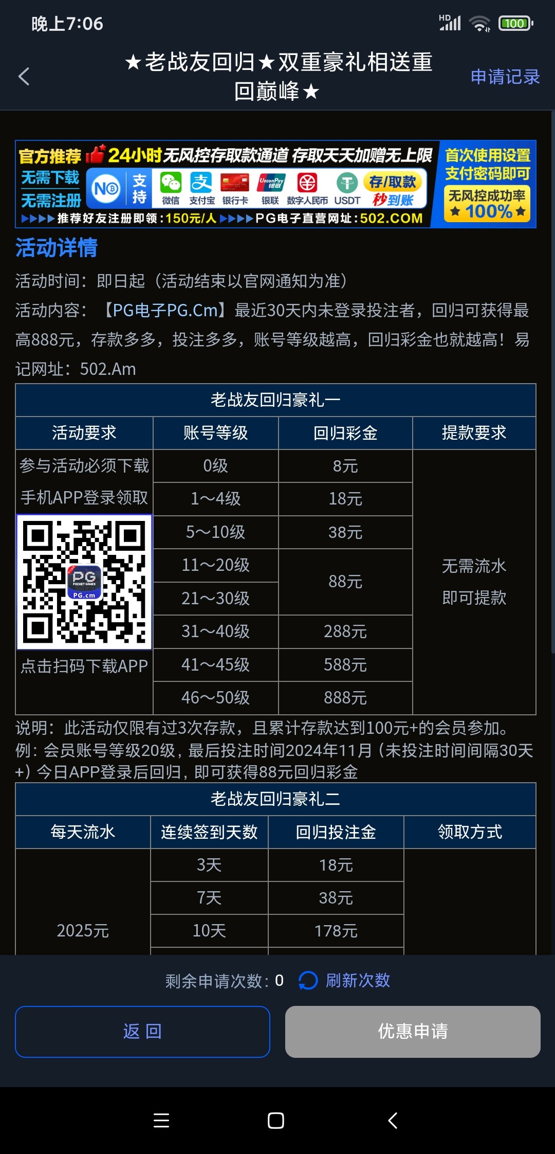 优惠里找回归活动自助申请。我是半小时通过