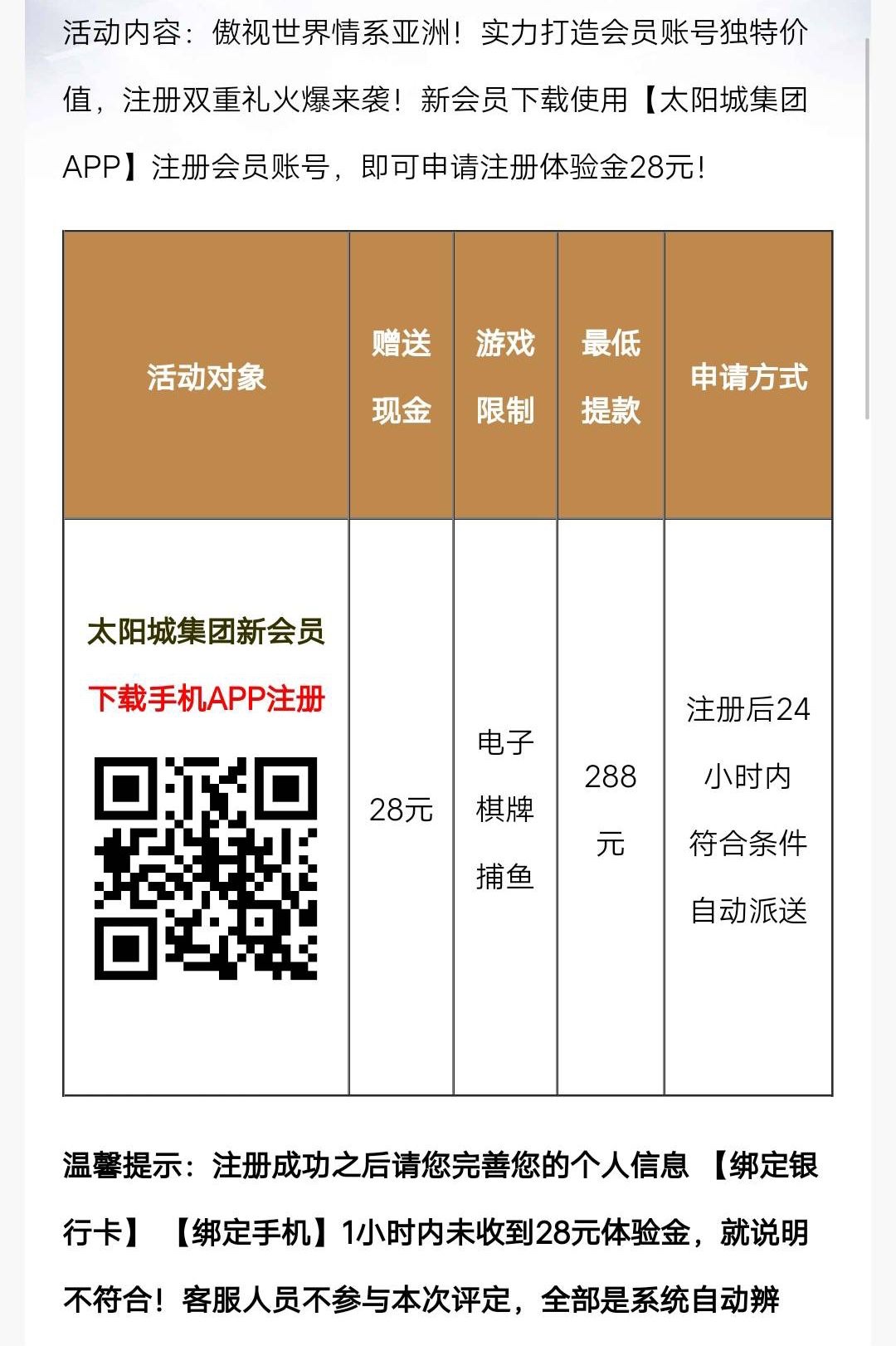 新用户注册下载完善资料一小时内送28,可以找客服试试。限制电子/棋牌/捕鱼,最低288提。