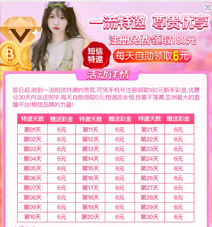 一流直播送180,每天送6,连送30天