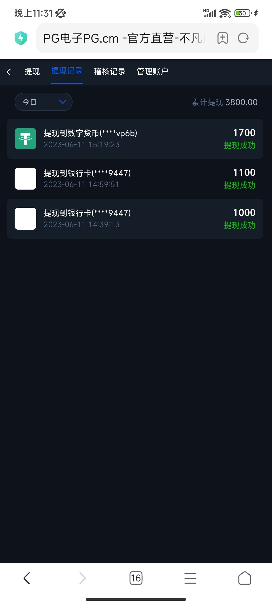 本站声明 1、本帖标题:提现三次,一次1000和1700都到账,但是中间一次1100显示到账,可我没收到钱,大家知道咋回事吗?是不是黑了