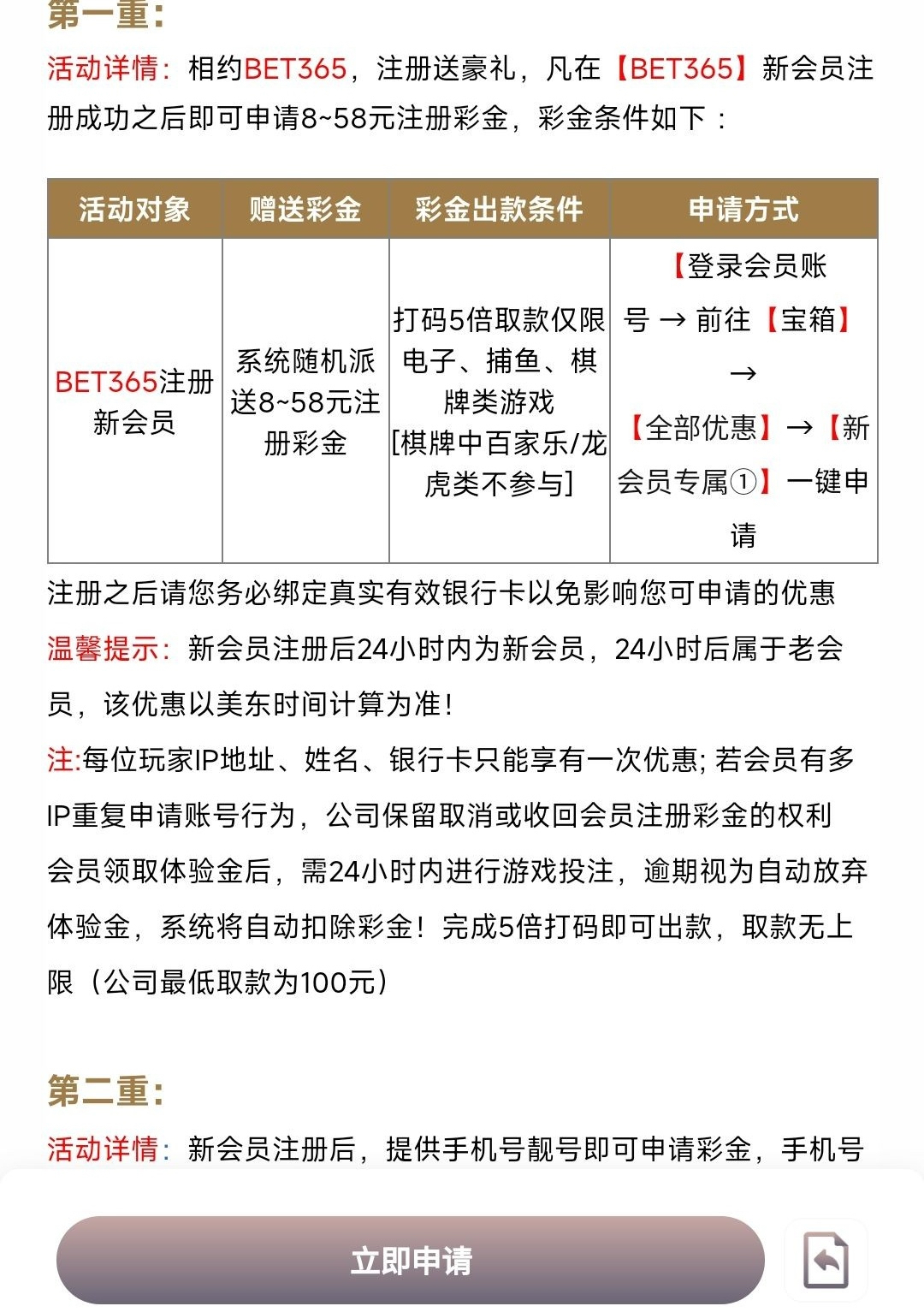 新用户注册绑卡前往宝箱点击新会员专属活动 申请送8/58,有审核时间,限制看下图