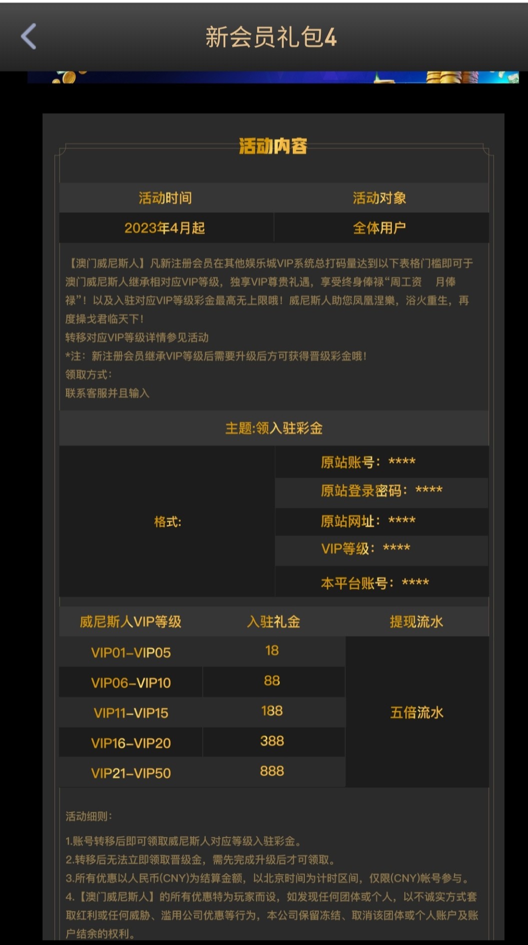 跳槽金,有其他台有充值记录等级高的对应找客服领彩金,最低18,无限制100提款!