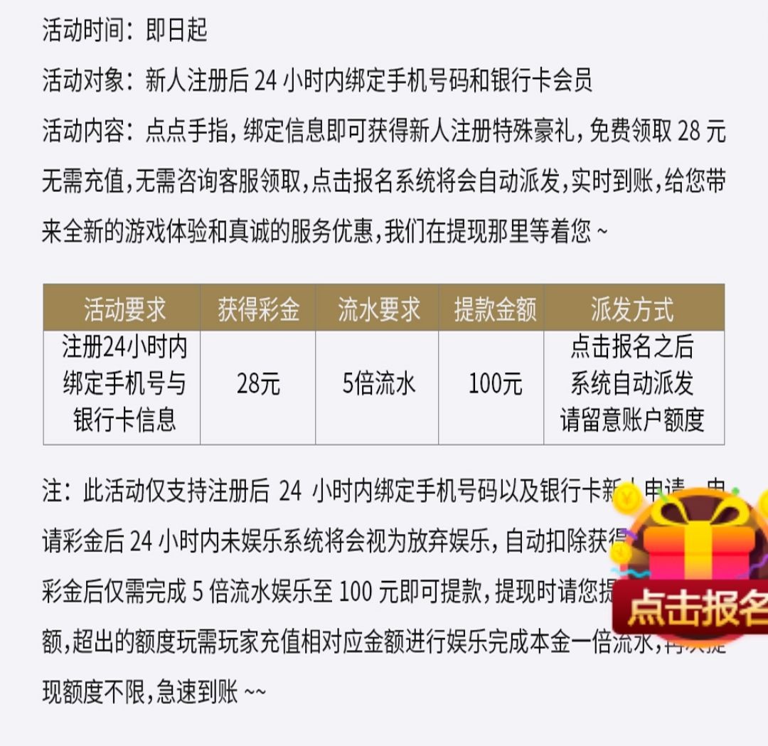 注册绑卡送28,活动申请,满百提,只能提现100,5倍流水,限制捕鱼棋牌电子。别充值,黑。